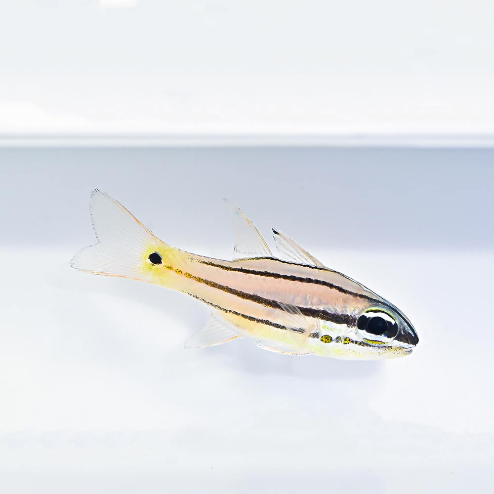 | Boardstriped cardinalfish Ma ubarwienie ciała białawe z pięcioma podłużnymi, miedzianymi do ciemnobrązowych, pasami, u nasady płetwy ogonowej ciemna, okrągła plamka, promienie płetw czerwonawe. Żeruje nocą, żywi się wieloszczetami oraz innymi drobnymi, dennymi bezkręgowcami. |
