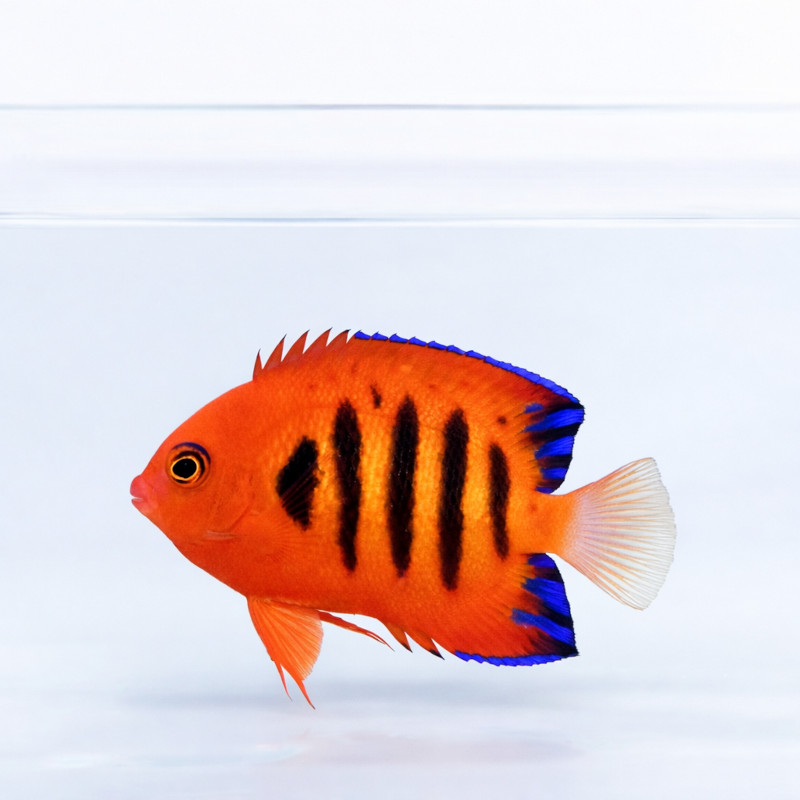 Centropyge loricula, znana również jako flaming angelfish, to jedna z najbardziej efektownych i popularnych ryb w akwarystyce morskiej. Posiada intensywnie czerwono-pomarańczową barwę z 4-6 pionowymi czarnymi pasami, które tworzą kontrastujący wzór na całym ciele. Krawędzie płetw grzbietowej i odbytowej zdobione są niebiesko-fioletowymi pasami, co dodatkowo podkreśla spektakularny wygląd tej ryby. Jej żywe ubarwienie i umiarkowane wymagania świetnie wpisują się w potrzeby średniozaawansowanych akwarystów.
