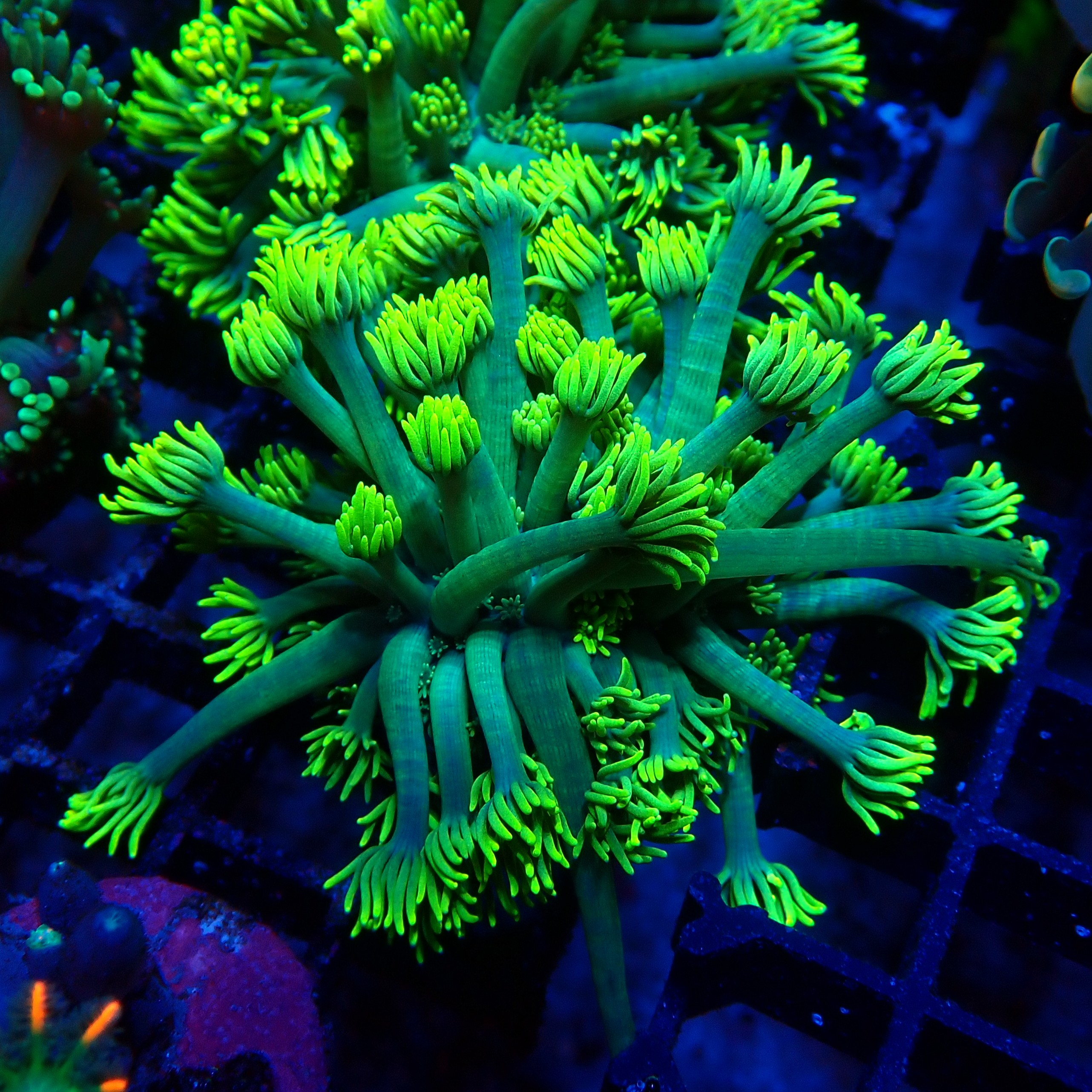 Goniopora to koralowiec twardy o długich polipach (**LPS**), ceniony za niezwykłą dynamikę i intensywne barwy. Charakteryzuje się długimi, rurkowatymi polipami, z których każdy zakończony jest wieńcem 24 czułków. Występuje w szerokiej gamie kolorystycznej – od neonowych zieleni i błękitów, po jaskrawe czerwienie i odmiany wielobarwne.