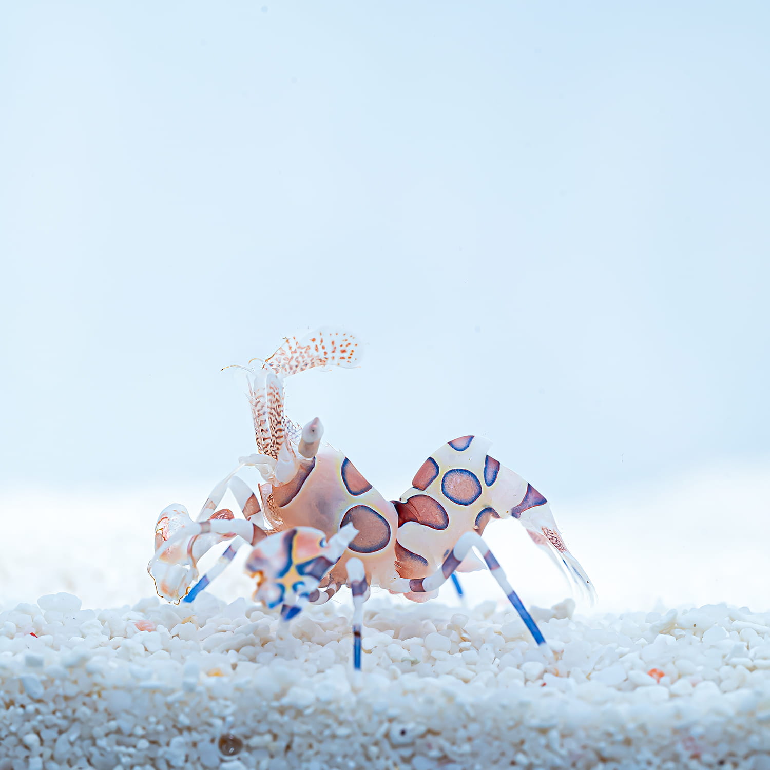 UwagiTa fascynująca krewetka jest nie tylko ozdobą akwarium, ale również interesującym obiektem obserwacji. Jej zachowania łowieckie i sposób obchodzenia się z pokarmem są fascynujące - krewetki często współpracują w parach podczas polowania, obracając i unieruchamiając rozgwiazdę.
