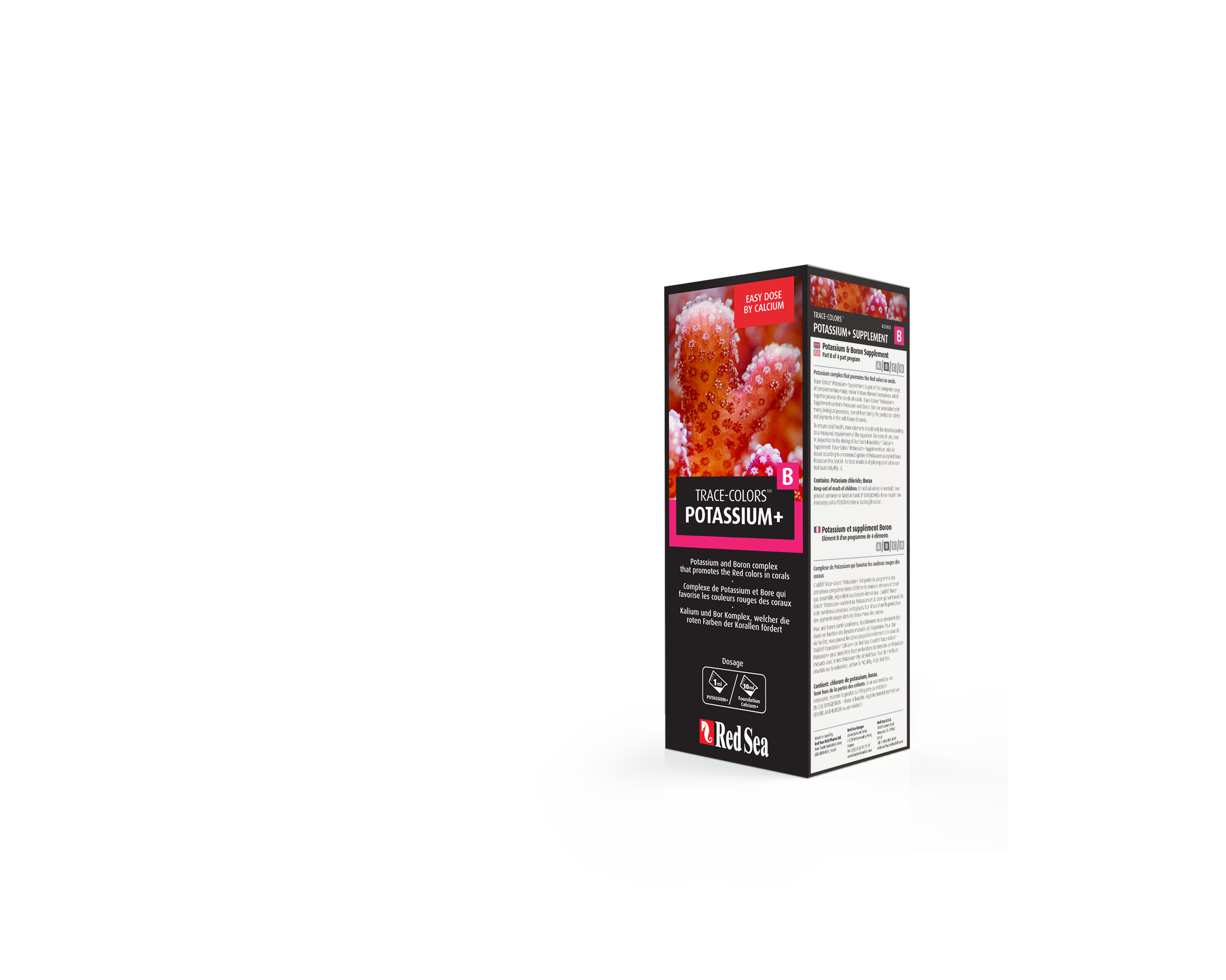 Red Sea Potassium+ - Trace Colors B - Środek zawierający skoncentrowany potas 500 mlSuplement POTASSIUM+ jest częścią pełnej gamy uzupełniających się kompleksów pierwiastków głównych, drugorzędnych i śladowych, które razem zaspokajają potrzeby koralowców.