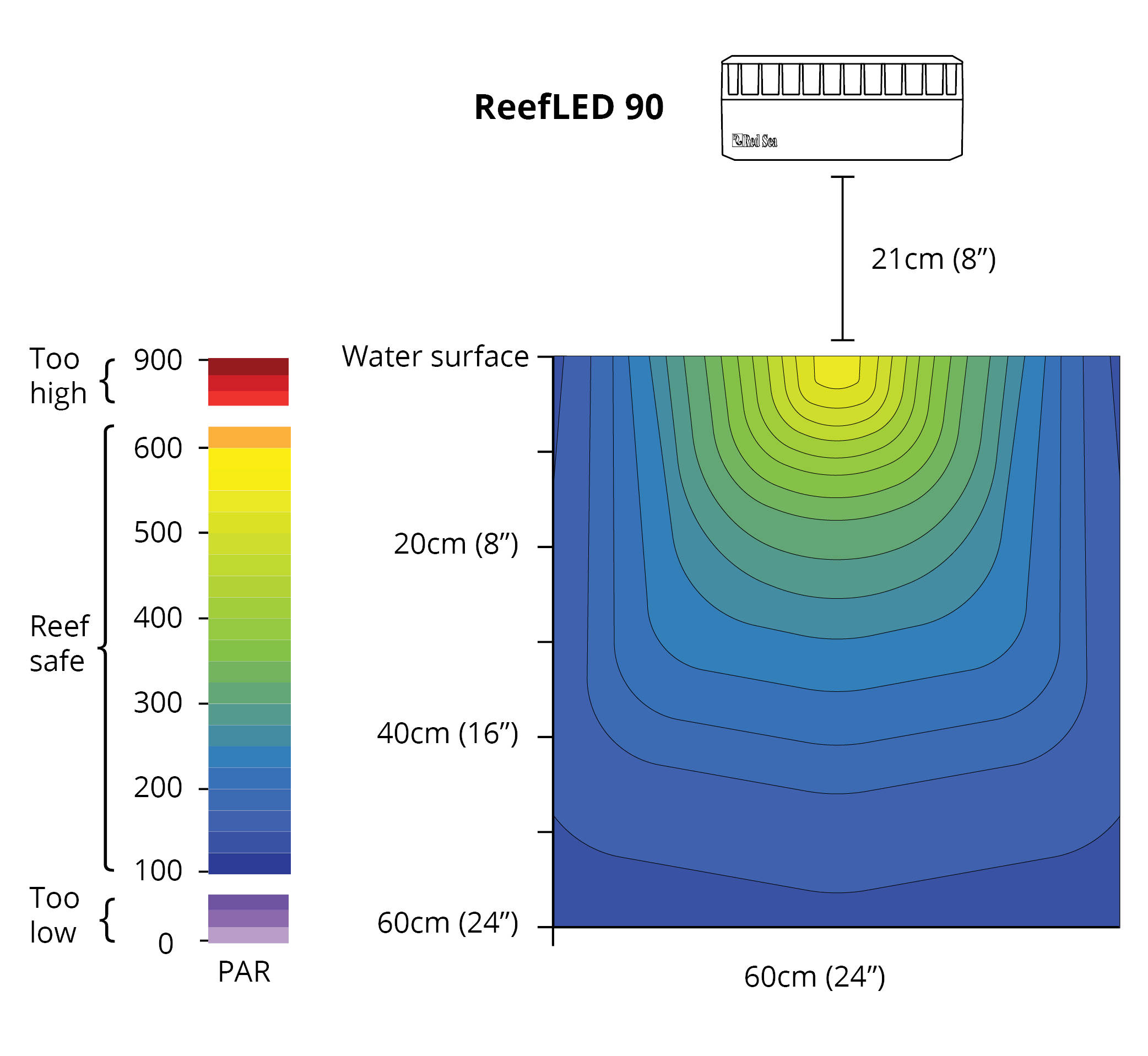 ReefLED 90 zapewnia poziomy PAR REEF-SPEC od 500 pod soczewką na powierzchni wody do 150 na głębokości 50 cm / 20 cali. Jest to zatem idealny wybór do zbiorników o średniej wielkości. Sercem jednostki jest pojedyncza, kompaktowa matryca LED, zapewniająca 90W światła REEF-SPEC i Reef-Safe LED. Zawiera 80 W o wielu długościach fali 23 000 Kelvin REEF-SPEC Blue (zastrzeżona mieszanka niebieskich, fioletowych i ultrafioletowych diod LED), wraz z 10 W o 9 000 Kelvin White oraz oddzielny kanał 3 W dla światła księżyca. Ta tablica zapewnia szeroką gamę światła REEF-SPEC, które zadowoli każdego akwrystę i jego koralowce. Lampy są wyposażone we wbudowane Wi-Fi, które umożliwia całkowitą kontrolę za pomocą inteligentnej aplikacji akwariowej ReefBeat.